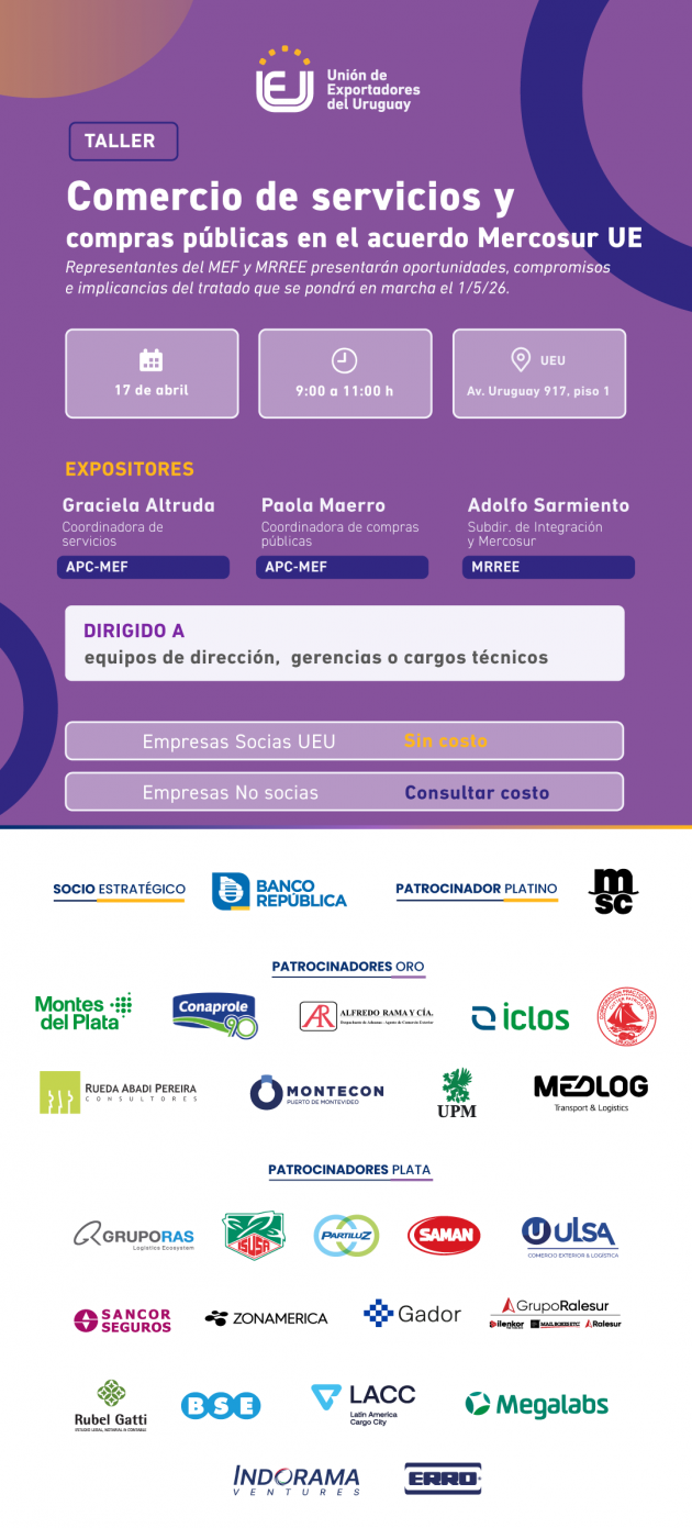 Con el objetivo de profundizar en estos aspectos, les invitamos a participar del taller "Comercio de servicios y compras públicas en el acuerdo Mercosur UE" , que realizaremos el viernes 17 de abril, de 9:00 a 11:00 h.